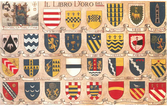 fasciato ondato di argento e di azzurro. - alias : fasciato ondato di argento e di azzurro, a sei tronchi di alberi di verde caricati nelle prime. Questa Casa si trasferì in Tramonti. Nocera dei Pagani, Cava e Castellamare, nelle quali Città godette nobiltà ed in quest'ultima si estinse in Orazio cavaliere di Malta (1578).